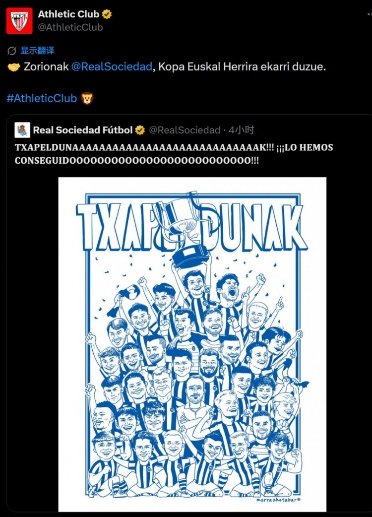 足坛新闻4月19日:在国王杯决赛中,皇家社会经过激烈角逐,以点球大战形式击败马竞,夺取冠军。毕尔巴鄂竞技的官方社媒账号分享了皇社夺冠的照片,并写下了祝贺:‘恭喜皇家社会,你们为巴斯克地区赢得了荣耀。’