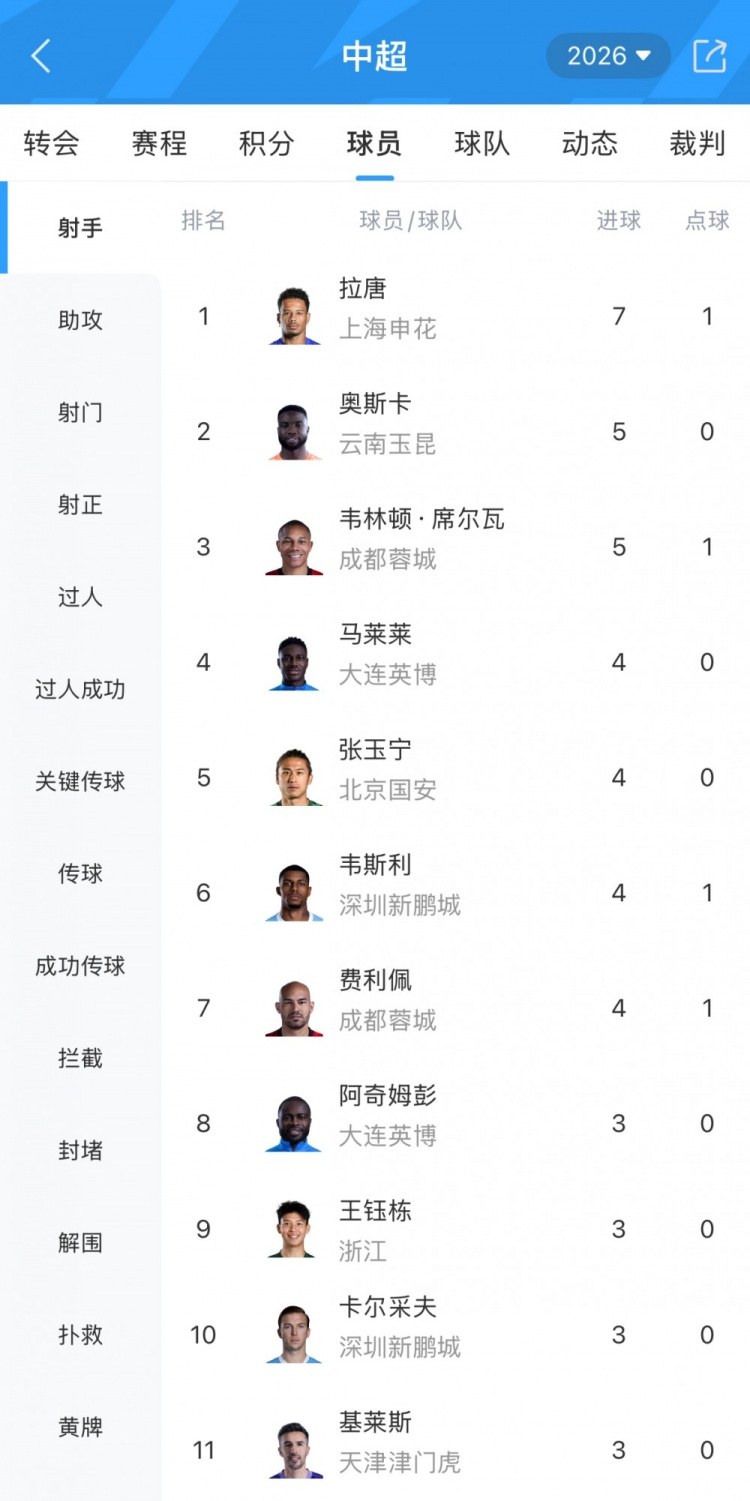 中超第6轮全部比赛结束,申花外援拉唐本轮收获2分,7球高居射手榜第一。奥斯卡与韦林顿·席尔瓦则均以5球紧随其后。射手榜前十名排名:1.拉唐(上海申花, 7球);2.奥斯卡(云南玉昆, 5球);2.韦林顿·席尔瓦(成都蓉城, 5球);4.马莱莱(大连英博, 4球);4.张玉宁(北京国安, 4球);4.韦斯利(深圳新鹏城, 4球);4.费利佩(成都蓉城, 4球);8.阿奇姆彭(大连英博, 3球);8.王钰栋(浙江, 3球);8.卡尔采夫(深圳新鹏城, 3球)。