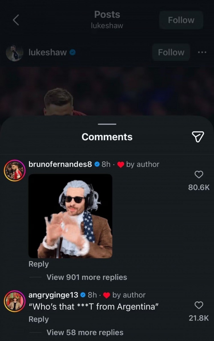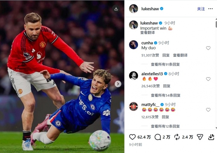 4月19日战报,曼联1-0淘汰切尔西后,中场球员鲁克肖分享一张将加纳乔放倒的照片,在社交平台掀起讨论。英格兰后卫发文‘重要胜利后,’引来队友们集体围观。队长B费评论GIF称‘这是公开处刑’,7小时内收获7.7万点赞。有球迷调侃‘那个阿根廷人怎么回事?’,鲁克肖用红心回应。库尼亚留言称‘我的队友’,泰勒·弗莱彻和谢伊·莱西也留下笑声表情。