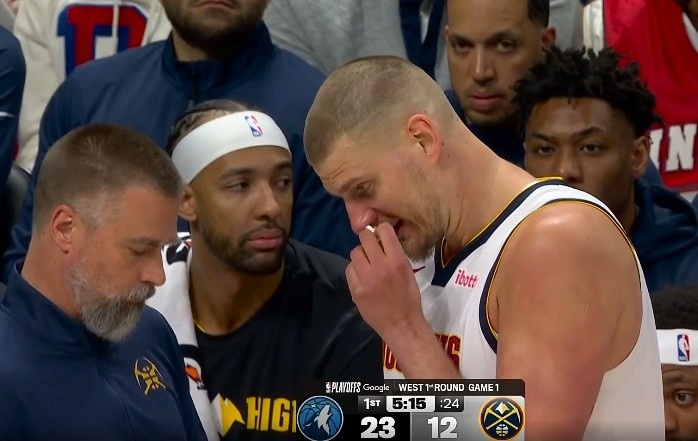 意外发生时,约基奇不幸被打到脸部,导致鼻子出血。然而他并未因此停下脚步,迅速调整后命中了一记三分球,展现了顽强的意志力。