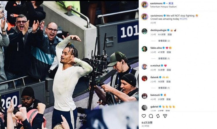 4月19日,英超联赛进行激烈角逐,热刺坐镇主场迎战布莱顿。比赛最终以2-2平局收场,哈维·西蒙斯发挥出色,送出关键助攻并打入世界波。第39分钟,西蒙斯送出精准挑传,波罗门前头球破门。第77分钟,西蒙斯在前场断球后内切兜射,一记精彩的世界波为球队扳平比分。赛后,西蒙斯在社交媒体上晒出庆祝照片,并写道:‘我们绝不会停止战斗!今天的观众真是太棒了!’