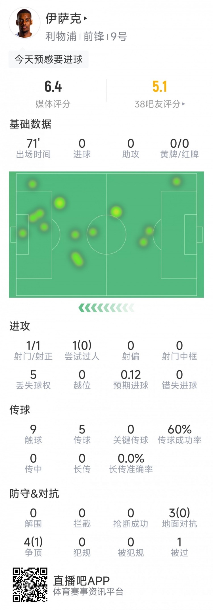 在本轮英超利物浦与埃弗顿的较量中,伊萨克获得71分钟出场时间。他贡献了1次射门(正中1次)、1次过人尝试(未果)、9次触球、5次传球(成功率60%)以及7次对抗(仅1次成功),最终获得6.4分评价。