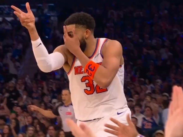 在激烈的比赛中,唐斯在底角接球后冷静出手,三分球精准命中。随着球在空中划出一道完美的弧线,观众席上爆发出雷鸣般的掌声。唐斯随即高兴地捂脸庆祝,这一刻成为了比赛最难忘的瞬间。