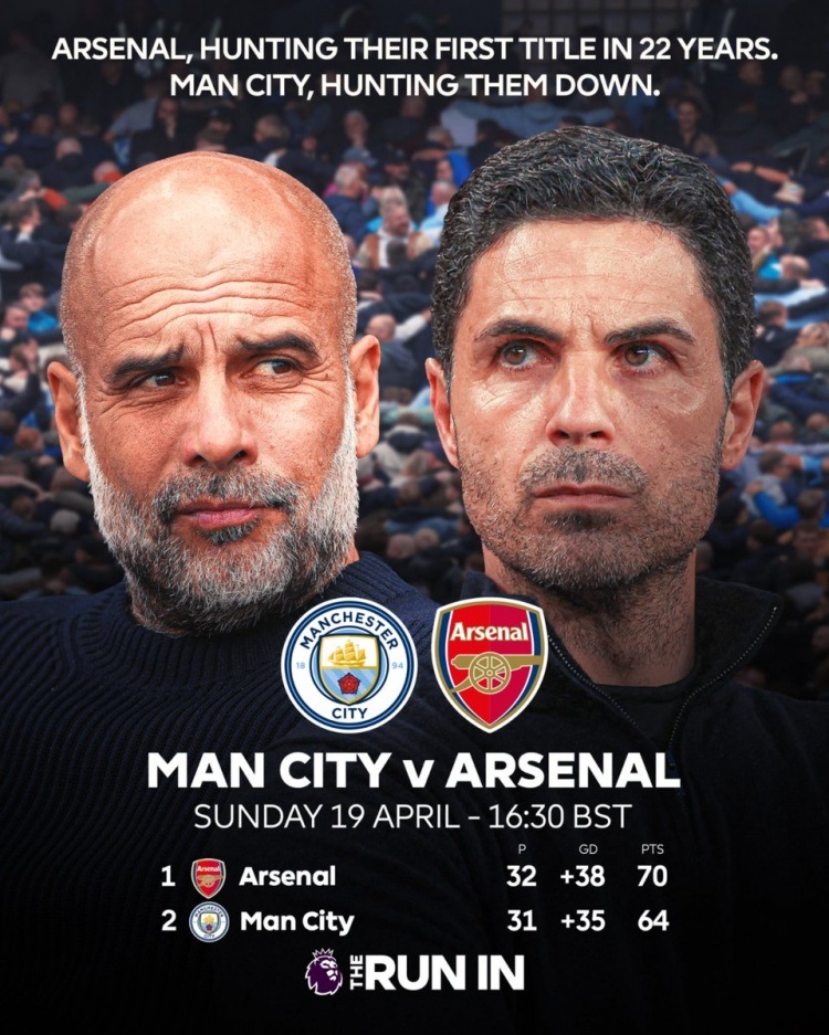 4月19日晚间,英超第33轮焦点战上演,曼城坐镇主场迎战阿森纳。英超官方发布战前海报,两支顶级球队的主教练瓜迪奥拉与阿尔特塔并列其中,彰显赛事重要性。积分榜方面,阿森纳以70分领跑全联赛,而曼城虽少赛一场,但积64分紧随其后,两队战意十足。