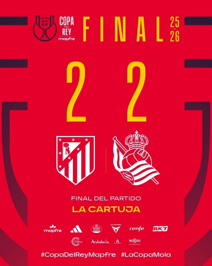4月19日凌晨3点,2025/26赛季国王杯决赛在中立场地打响,马德里竞技对阵皇家社会。上半场风云突变,巴雷内切亚开场15秒闪电破门,卢克曼迅速扳平,奥亚萨瓦尔点射反超。下半场替补登场的阿尔马达送出助攻,阿尔瓦雷斯83分钟扳平比分,将比赛拖入加时。90分钟战罢,双方1-1战平,进入残酷加时。