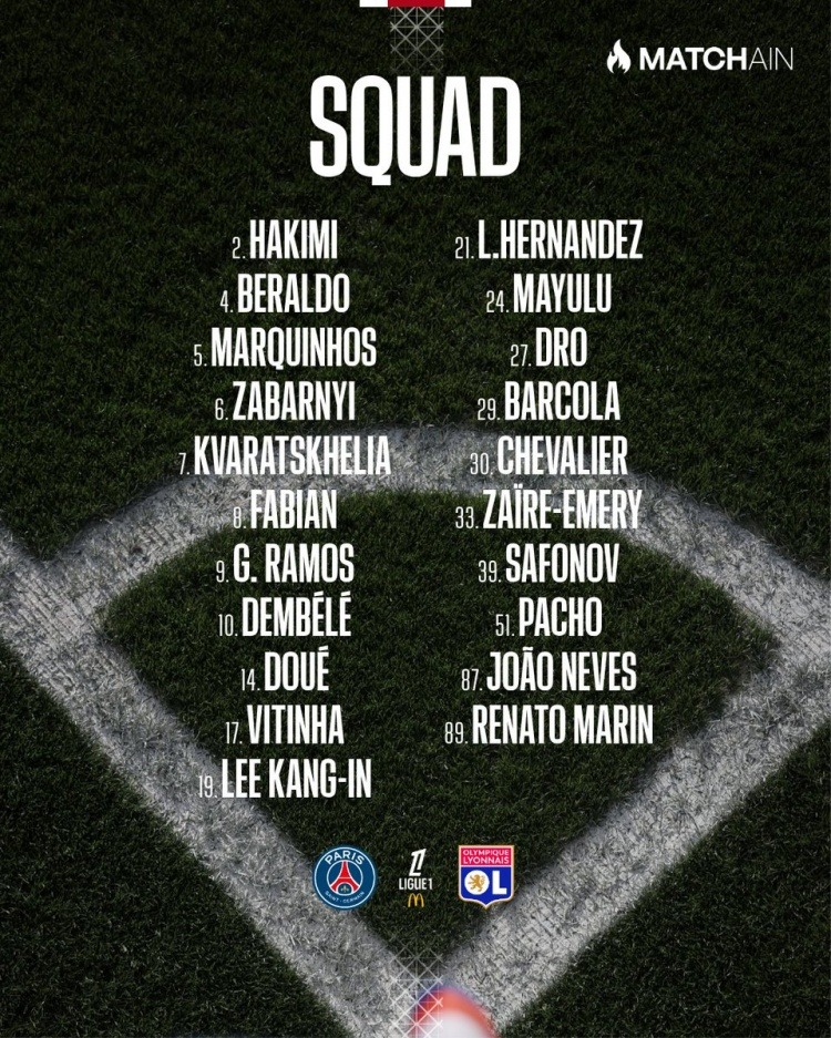 北京时间4月19日凌晨,法甲第30轮焦点战巴黎主场迎战里昂,巴黎俱乐部正式公布本场比赛的参赛阵容。法比安·席尔瓦强势回归,而姆巴耶和努诺·门德斯意外落选。以下是巴黎队的大名单: