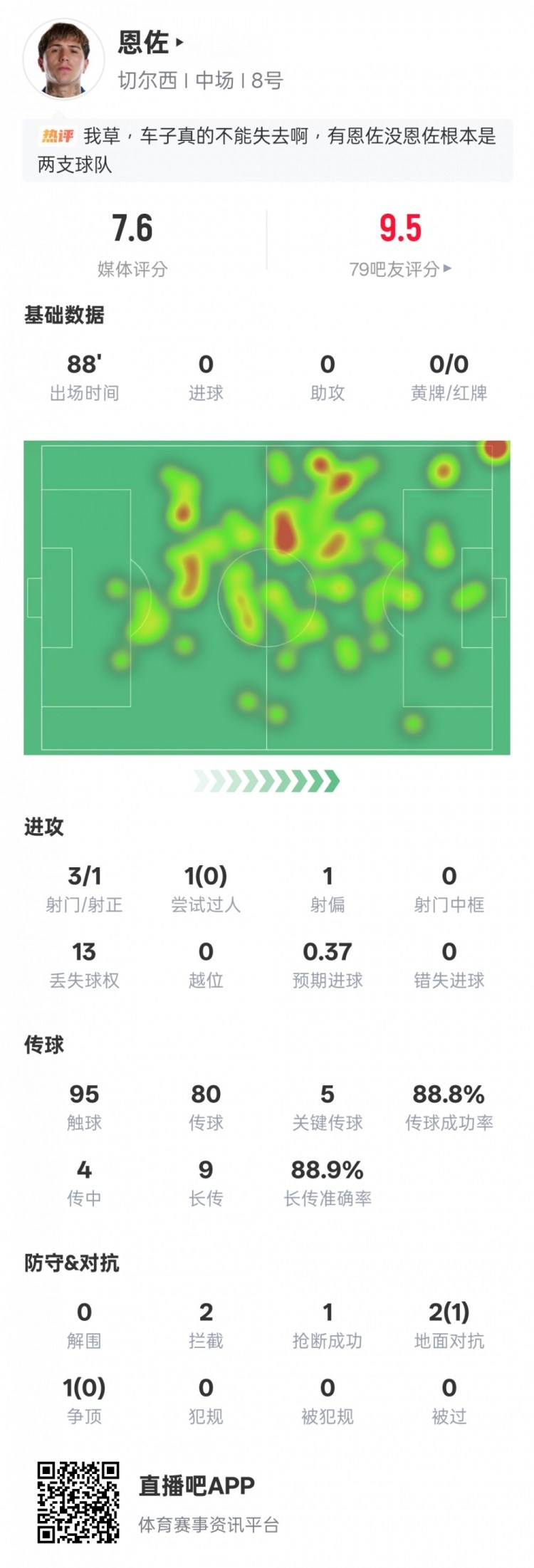 切尔西主场迎战曼联的英超焦点战中,恩佐告别禁赛首发出战,表现抢眼。他完成1次射正,贡献5次关键传球,并收获2次拦截和1次抢断,最终获得7.6分的高评价。详细数据如下: 进球:0 助攻:0 射门:3 射正:1 过人:1 过人成功:0 射偏:1 丢失球权:13 触球:95 传球:80 关键传球:5 传球成功率:88.8% 传中:4 长传:9 长传准确率:88.9% 拦截:2 抢断:1 地面对抗:2 地面对抗成功:1 争顶:1 争顶成功:0