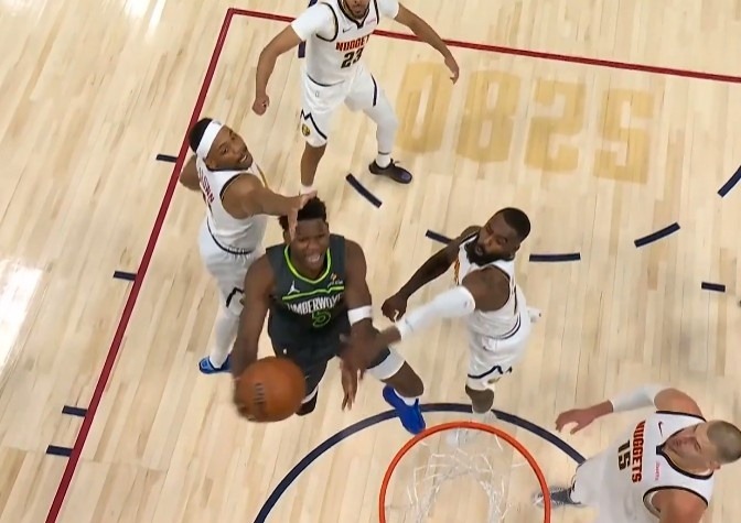 在这场激烈的比赛中,爱德华兹展现了无畏的勇气,他突破了掘金队多名球员的防守,成功上篮得分,为球队争得了宝贵的一分。这一幕充分体现了他的突破能力和决心。