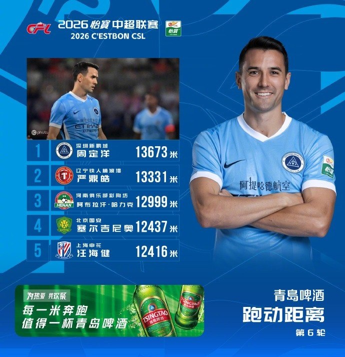 最新体育报道4月19日:中超联赛第六轮的跑动距离数据公布,深圳新鹏城球员周定洋以13673米的惊人跑动距离排名第一,紧随其后的是辽宁铁人的严鼎皓,以13331米位列第二,河南龙的阿布拉汗则以12999米排名第三,北京国安的塞尔吉尼奥跑动12437米,上海申花的汪海健跑动12416米。