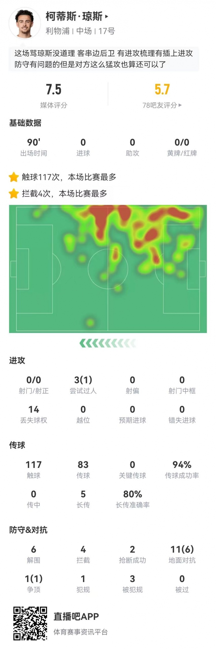 利物浦主场迎战埃弗顿,柯蒂斯·琼斯顶替主力位置担任右后卫,全场数据概览:首发并完成整场表现,未参与射门,成功3次过人,遭遇14次丢球,触球117次,传球83次(成功率94%),完成5次长传并命中4次,贡献6次解围、4次拦截、2次抢断,进行12次对抗并成功7次,制造3次犯规,最终获得7.5分评价。