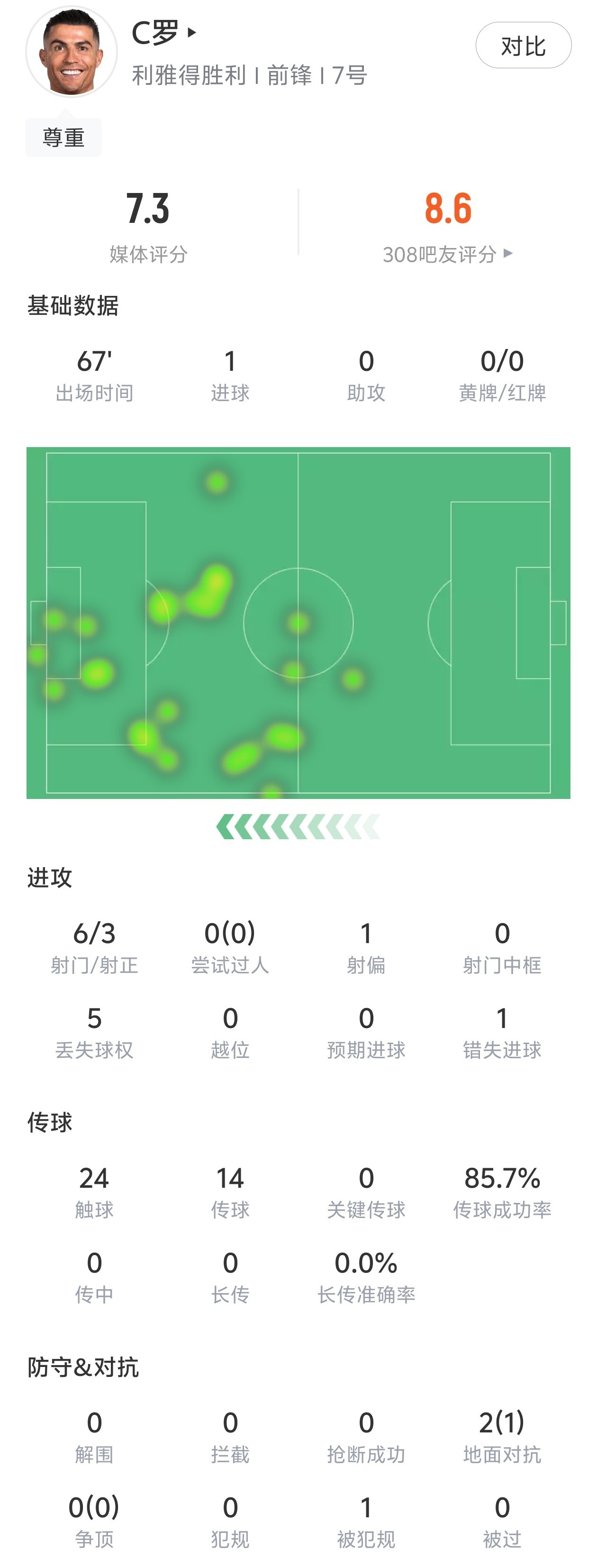 亚冠赛事中,利雅得胜利与迪拜祈祷的对决里,C罗的表现引人注目。他替补登场67分钟,贡献一粒进球,射门6次中3。C罗在场上传球14次,成功率为85.7%,此外,他在对抗中胜出1次,无犯规且被犯规1次,最终得到7.3分。