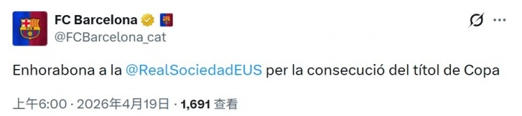 巴萨官方祝贺皇家社会加冕国王杯桂冠