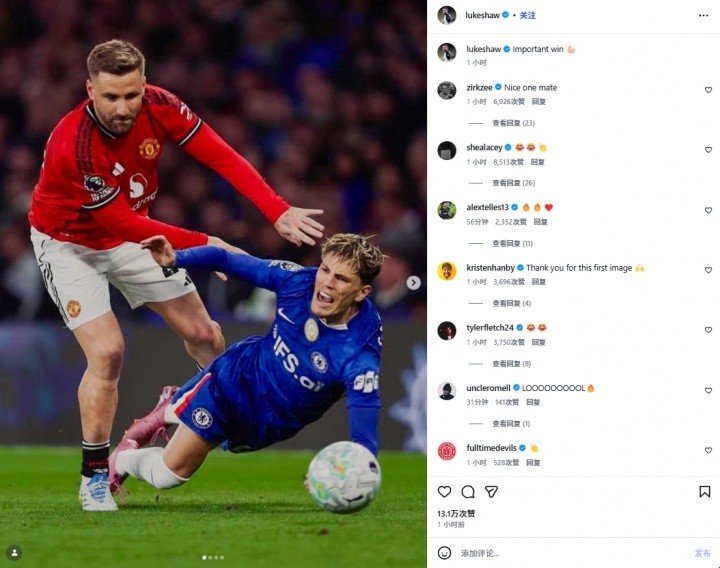 体育新闻4月19日:在最近的英超联赛中,切尔西队以0-1的比分败给曼联队。赛后,卢克·肖通过个人Instagram账号发布了四张照片,其中第一张照片显示他与加纳乔并肩而立,加纳乔的姿势显得有些狼狈。肖在配文中称这场胜利意义重大。发布后,不少球迷在评论区留言调侃。