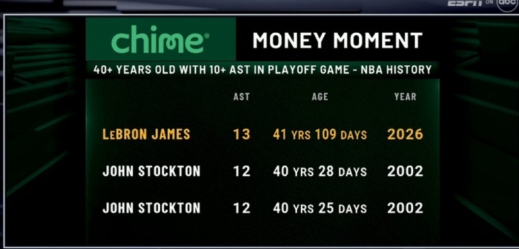湖人在季后赛首轮G1中主场以107-98力克火箭,系列赛取得1-0领先。勒布朗·詹姆斯全场出战38分钟,高效拿分,最终得到19分、8篮板、13助攻、2抢断和1盖帽。值得一提的是,他送出的13次助攻打破了斯托克顿保持的40岁球员季后赛单场助攻纪录。