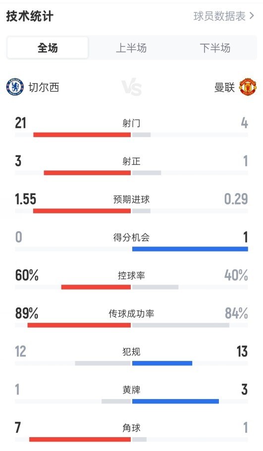 英超第33轮激战,切尔西主场迎战曼联,最终以0-1告负。全场数据呈现如下:双方共完成21-4次射门,其中3-1次射正。预期进球比为1.55-0.29,实际进球机会为0-1。控球率方面,切尔西占60%,曼联为40%。传球成功率分别为89%(切尔西)与84%(曼联)。犯规数量为12-13,黄牌 issuance 为1-3,角球数量为7-1。