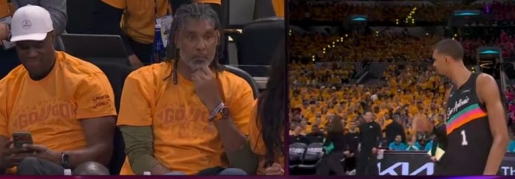 文班亚马在第三节没有得分,第四节霍乐迪半绕前时,马刺喂文班亚马空接罚球。从此开始,文班亚马开始打开拓者大球阵:在克林根和阿夫迪亚夹击中勾射,弧顶一发三分,背身一串舞动打板第30分——镜头给到场边的邓肯,因为是“打板”。