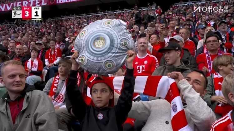 领先优势巨大 拜仁小球迷看台挥舞沙拉盘抱枕