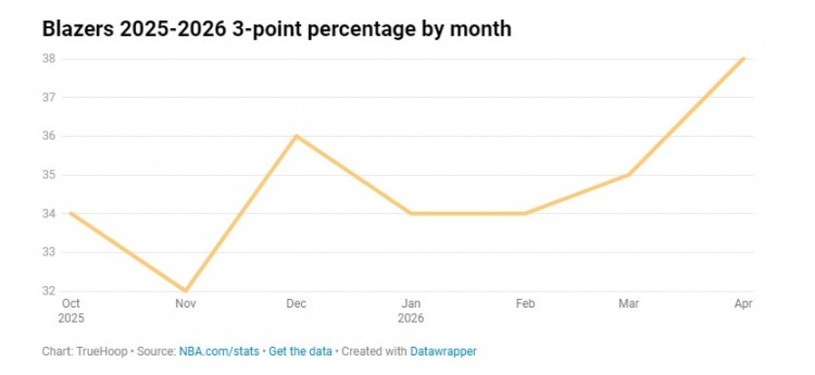开拓者本赛季的三分命中率仅为34%,长期处于联盟末位,这曾让他们的进攻备受质疑。然而,他们另辟蹊径,通过突破内线造犯规或发动大量三分雨来弥补外线短板。这种战术在常规赛中取得了不错的效果,82场比赛中有17场三分命中率突破40%,取得了14胜3负的骄人战绩。近期,核心球员如塞布尔、格兰特、卡马拉、亨德森和克林根的三分投射均呈现上升趋势,这并非偶然。