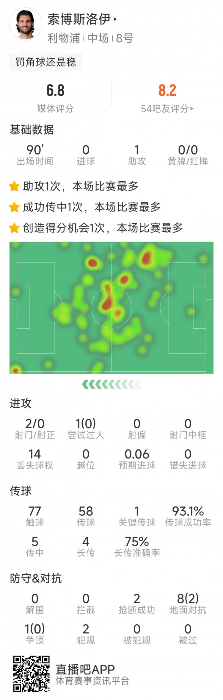 在本轮英超利物浦2-1战胜埃弗顿的比赛中,索博斯洛伊有着出色的表现。他送出了一次关键的助攻,完成2次射门但无一命中,同时贡献了2次抢断。全场触球77次,关键传球1次,传球成功率高达93%,成功对抗9次并拿下2次。最终获得6.8分评价。
