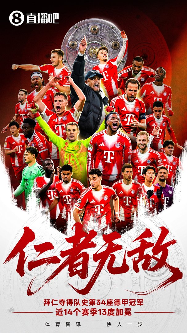 体育快讯4月20日报,德甲联赛第30轮,拜仁慕尼黑4-2力克斯图加特,强势提前4轮锁定2025-26赛季德甲总冠军,成功完成卫冕。这不仅标志着拜仁队史第34次问鼎德甲,更是其第35次夺取顶级联赛桂冠,近14年来已连续13次称霸德甲,展现出无与伦比的统治力。本赛季,拜仁一路披荆斩棘,30轮联赛仅败北一次,109粒入账进球更是刷新了自家保持的德甲单赛季进球纪录。以下是拜仁德甲34冠的完整夺冠赛季列表:(1968-69, 1971-72, 1972-73, 1973-74, 1979-80, 1980-81, 1984-85, 1985-86, 1986-87, 1988-89, 1989-90, 1993-94, 1996-97, 1998-99, 1999-00, 2000-01, 2002-03, 2004-05, 2005-06, 2007-08, 2009-10, 2012-13, 2013-14, 2014-15, 2015-16, 2016-17, 2017-18, 2018-19, 2019-20, 2020-21, 2021-22, 2022-23, 2024-25,2025-26)。