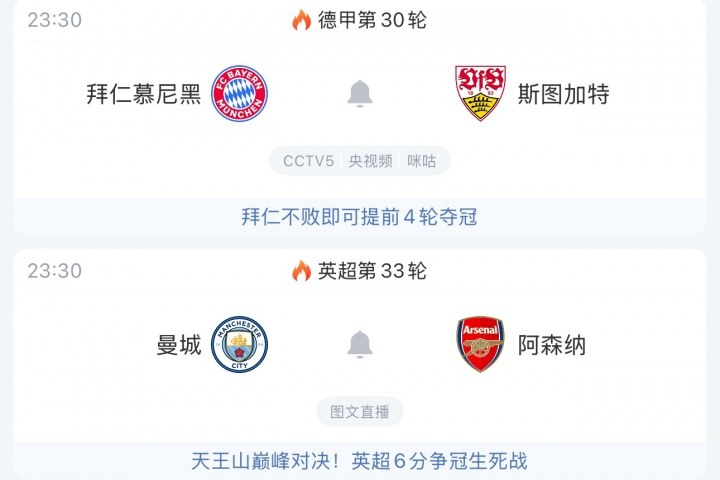 今夜22:30,两场焦点赛事同步上演:曼城阿森纳的英超关键战、拜仁的德甲冲刺战!曼城将在阿提哈德球场挑战阿森纳,此役决定英超冠军归属,两队实力相当,比赛悬念迭起。德甲方面,拜仁主场迎战斯图加特,若保持不败,冠军将提前4轮到手。本赛季已获超级杯冠军的拜仁,正朝着四冠王的目标前进。