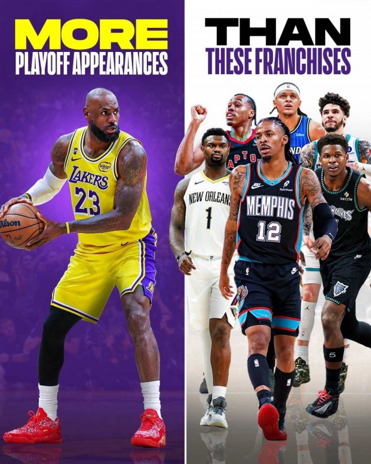 勒布朗·詹姆斯在季后赛中出场次数达到惊人的第19次,历史总排名超越前人。与他的竞争者们相比,魔术队有18次季后赛经历,灰熊、森林狼和猛龙队分别有14次,黄蜂队有10次,鹈鹕队则有9次。