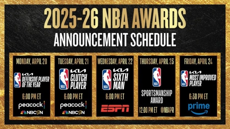 最新体育新闻4月20日,NBA官方今日发布了本赛季部分常规赛奖项的公布日程(均为北京时间),具体如下:最佳防守球员将在4月21日周二凌晨6:00公布;最佳关键球员定于4月22日周三凌晨6:00揭晓;最佳第六人的归属将在4月23日周四凌晨6:00确定;体育道德风尚奖将于4月24日周五凌晨0:00公布;最快进步球员将在同日周五凌晨6:30揭晓。相关新闻链接已提供。