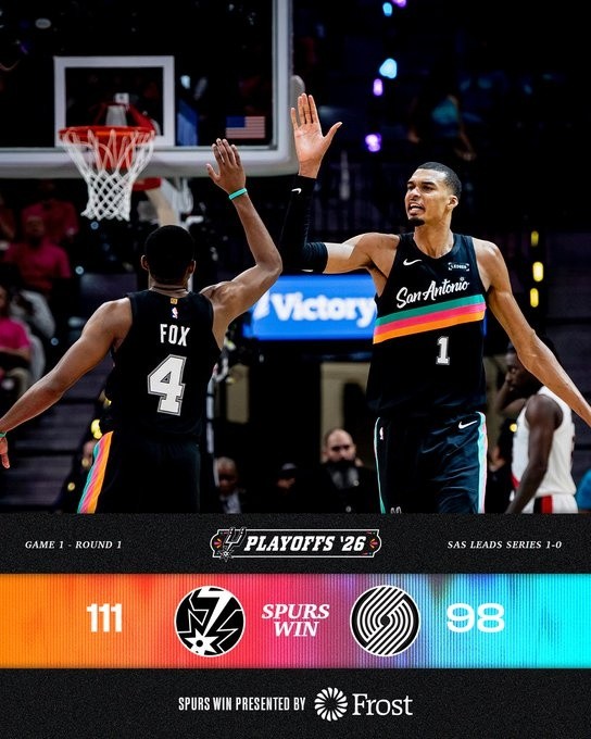 NBA季后赛首轮激战,马刺主场以111比98力克开拓者,将总比分改写为1比0。赛后,马刺官方社交媒体发布胜利海报,文班亚马与福克斯成为焦点人物。文中班亚马出战32分50秒,21投13中,三分6中5,罚球5中4,狂揽35分5篮板1助攻2盖帽,正负值+4。福克斯出场34分钟,15投7中,三分5中2,罚球2中1,收获17分5篮板8助攻1抢断,正负值+12。