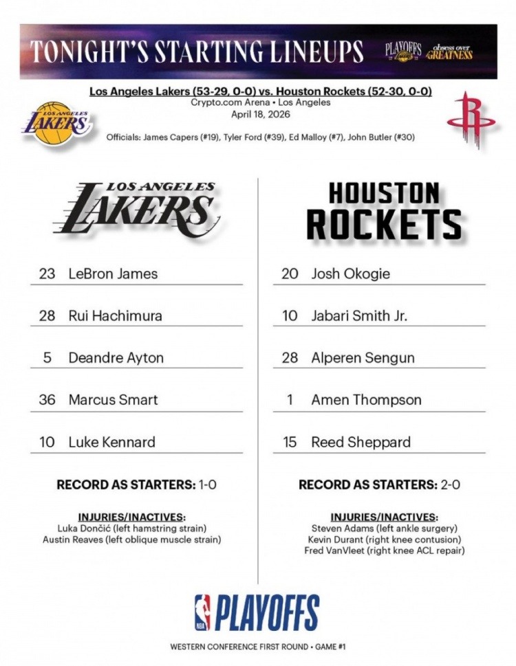 季后赛开战倒计时:湖人首发五人名单出炉