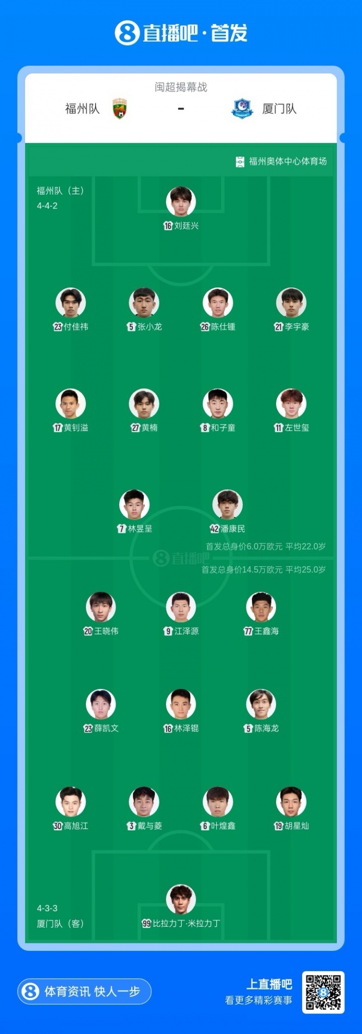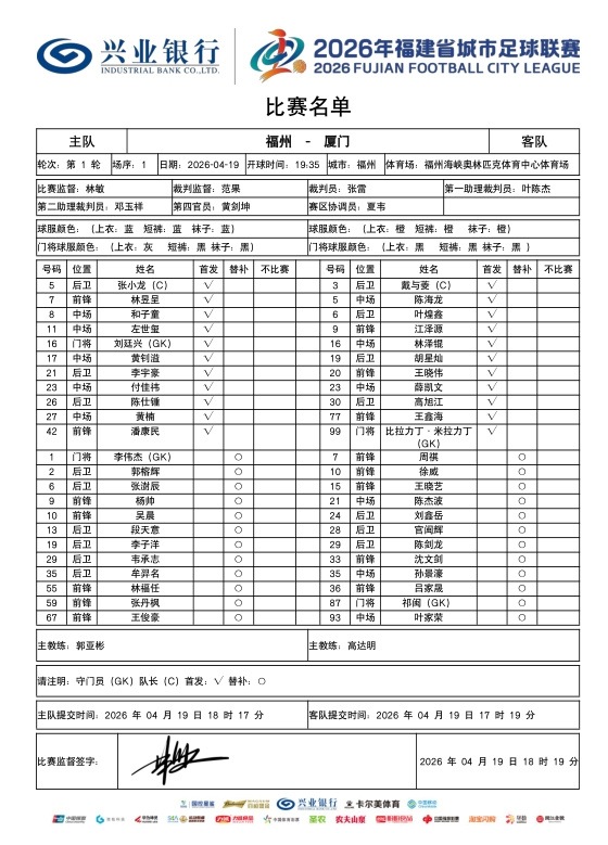 19日体育快讯,今晚19点闽超揭幕战福州队迎战厦门队,首发阵容正式揭晓。福州队由张小龙、戴与菱担任队长,厦门队阵容同样星光熠熠。详见下文首发阵容及裁判信息。福州队首发:16-刘廷兴、5-张小龙、21-李宇豪、26-陈仕锺、8-和子童、11-左世玺、17-黄钊溢、23-付佳祎、27-黄楠、7-林昱呈、42-潘康民。福州队替补:1-李伟杰、2-郭榕辉、6-张澍辰、9-杨帅、10-吴晨、13-段天意、19-李子洋、29-韦承志、35-牟羿名、55-林福任、59-张丹枫、67-王俊豪。厦门队首发:99-比拉力丁·米拉力丁、3-戴与菱、6-叶煌鑫、19-胡星灿、30-高旭江、5-陈海龙、16-林泽锟、23-薛凯文、9-江泽源、20-王晓伟、77-王鑫海。厦门队替补:87-祁闽、7-周祺、10-徐威、15-王晓艺、21-陈杰波、24-刘鑫岳、28-官闽辉、29-陈剑龙、33-沈文剑、35-孙景濠、36-吕家晟、93-叶家荣。本场由张雷担任主裁判,叶陈杰、邓玉祥为助理裁判,黄剑坤担任第四官员,范果负责裁判监督。