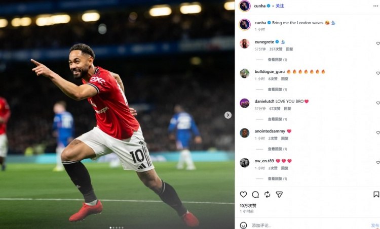 体育快讯4月19日 曼联在英超关键战中客场1-0击败切尔西,B费送出助攻,库尼亚打入决定胜负的进球。赛后,库尼亚在社交媒体上发布了自己庆祝进球的照片,并配文:‘让伦敦的波涛因我而汹涌澎湃😘🏄🏾‍♂️’。