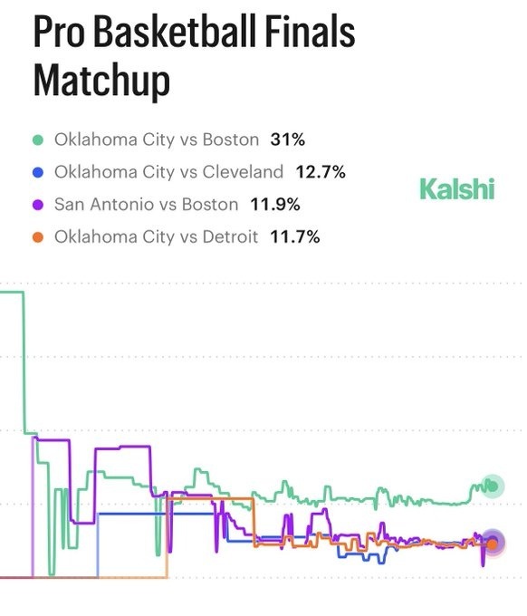 最新赛事分析显示,预测平台Kalshi发布了总决赛可能的对阵组合及其概率。根据数据,雷霆对阵凯尔特人的胜率最高,为31%。其次是雷霆与骑士的对决,概率为12.7%。马刺对阵凯尔特人的概率为11.9%,而雷霆对阵活塞的对战概率为11.7%。