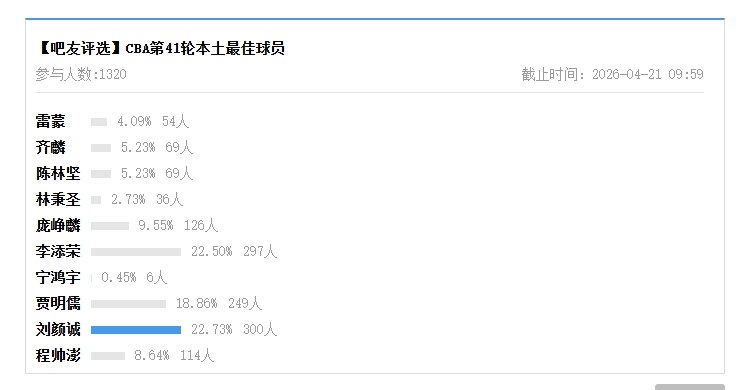 球迷投票选出CBA第41轮本土最佳:刘颜诚拔得头筹