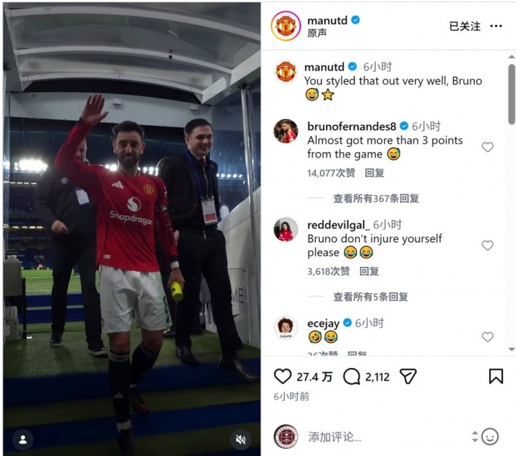 英超联赛第33轮,B费送出助攻,助曼联客场1-0战胜切尔西。比赛结束后,曼联官方社媒发布B费离场时的视频,他下台阶时差点滑倒,还对着镜头挥手。曼联社媒调侃道:“布鲁诺,这次化解得妙啊!”B费幽默回复:“差点靠这场拿到更多分数。”