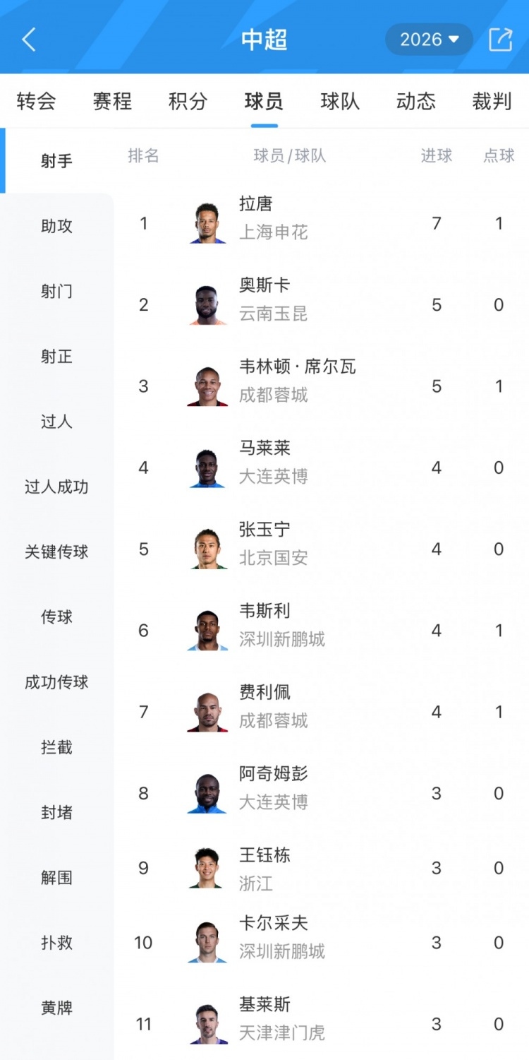 4月19日,中超第6轮赛事收官,申花外援拉唐凭借本轮梅开二度,累计7球领跑射手榜。奥斯卡与韦林顿·席尔瓦分列其后,均以5球追平。完整排名如下:1.拉唐(上海申花, 7球);2.奥斯卡(云南玉昆, 5球);2.韦林顿·席尔瓦(成都蓉城, 5球);4.马莱莱(大连英博, 4球);4.张玉宁(北京国安, 4球);4.韦斯利(深圳新鹏城, 4球);4.费利佩(成都蓉城, 4球);8.阿奇姆彭(大连英博, 3球);8.王钰栋(浙江, 3球);8.卡尔采夫(深圳新鹏城, 3球)。