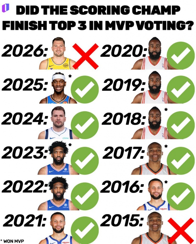 最新NBA消息,本赛季MVP前三候选名单公布,东契奇未能入选。这是自2015年威斯布鲁克以来,首位未能进入MVP前三的联盟得分王。本赛季,东契奇为湖人出场64次,场均贡献33.5分、7.7篮板、8.3助攻,荣登得分王宝座。
