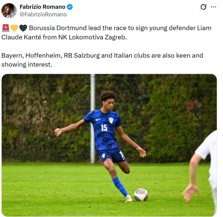 体育消息4月19日:知名足球记者罗马诺透露,多特蒙德在争夺15岁的萨格勒布火车头年轻后卫利亚姆·克劳德·坎特时占据领先地位。据悉,拜仁、霍芬海姆、萨尔茨堡红牛以及意大利的几家俱乐部也对这位拥有法国和克罗地亚双重国籍的边锋非常感兴趣。