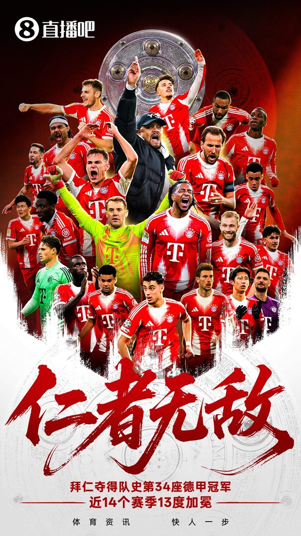 体育界动态4月20日,德甲联赛第30轮赛事落下帷幕,拜仁慕尼黑凭借4-2的胜利,强势提前4轮夺取2025-26赛季德甲冠军,成功续写卫冕传奇。此番胜利,为拜仁慕尼黑捧起了队史上的第34个德甲冠军奖杯,同时也是其第35个顶级联赛冠军,历史性地把持了近14年来13个赛季的德甲霸主宝座,笑傲群雄。纵观本赛季,拜仁的表现犹如神助,30轮联赛仅品尝一次失利滋味,109粒进球更是将自家保持的德甲单赛季进球纪录远远甩在身后。值得铭记的德甲34冠夺冠赛季依次为:(1968-69, 1971-72, 1972-73, 1973-74, 1979-80, 1980-81, 1984-85, 1985-86, 1986-87, 1988-89, 1989-90, 1993-94, 1996-97, 1998-99, 1999-00, 2000-01, 2002-03, 2004-05, 2005-06, 2007-08, 2009-10, 2012-13, 2013-14, 2014-15, 2015-16, 2016-17, 2017-18, 2018-19, 2019-20, 2020-21, 2021-22, 2022-23, 2024-25,2025-26)。