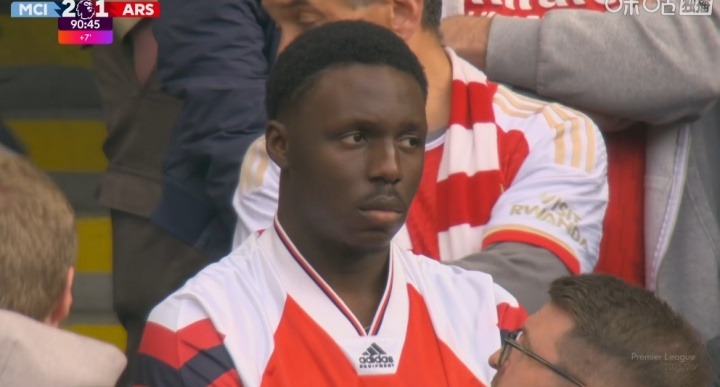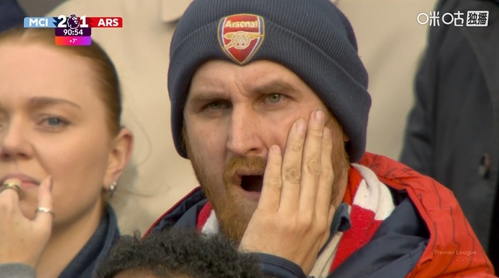 体育新闻4月20日:阿森纳与曼城的比赛中,补时阶段枪手未能扳平比分,依旧落后,镜头切换至看台,阿森纳球迷的痛苦表情清晰可见。