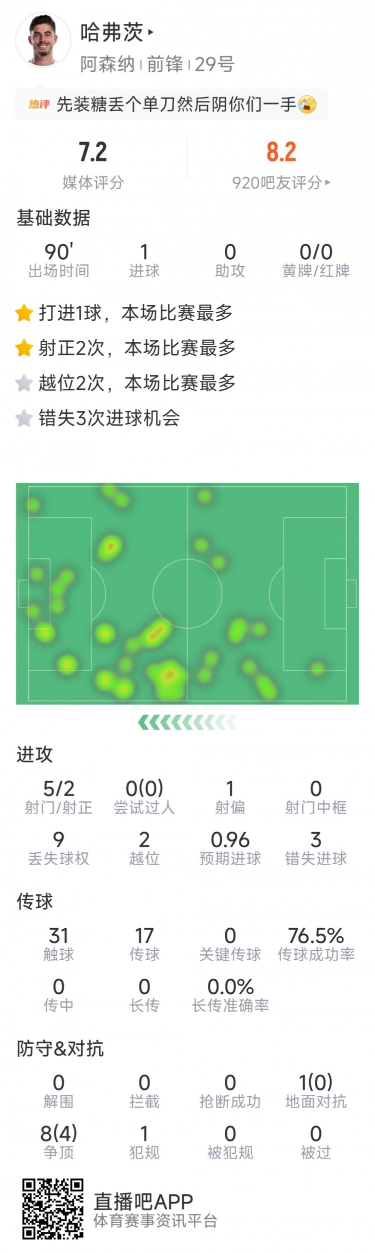 4月20日体育报道:曼城坐镇主场2-1小胜阿森纳,哈弗茨全场表现获评7.2分。数据方面,他打入1球,射门5次仅2次命中,3次精彩机会失之交臂。其他关键数据:触球31次,传球成功率76.5%,对抗9次成功4次。