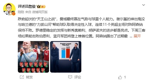 最新体育资讯04月20日 曼城客场2-1战胜阿森纳,评论员詹俊强调,比赛胜负在于球员的气势和硬实力。谢尔基的神来之笔和哈兰德的强力头槌锁定胜局,打破11连胜的不败金身。贝-席罗德里贡献稳健,奥赖利胡萨诺夫进步显著。蓝月军团若下周三客场拿下伯恩利,将登顶榜首。阿森纳虽踢得极具侵略性,但未能将机会转化为进球。若保持此状态,仍有望延续悬念。
