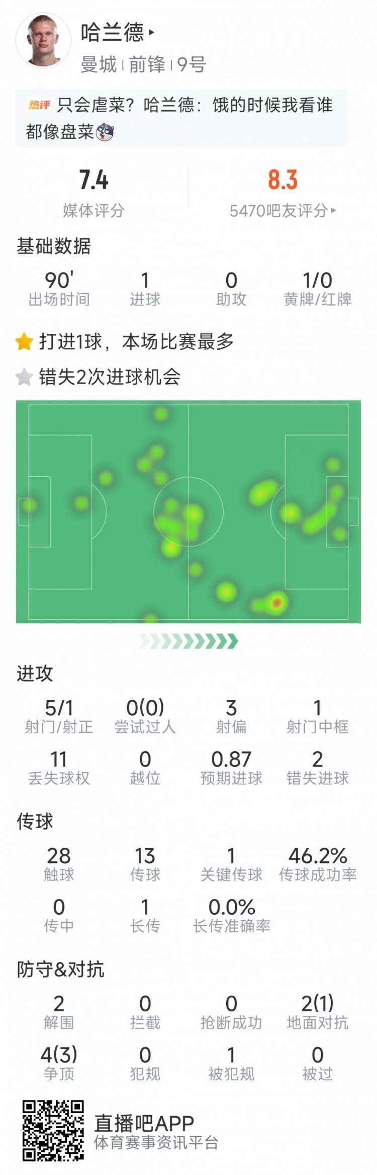 曼城客场2-1擒阿森纳,哈兰德全场表现见闻: 常规90分钟比赛 斩获1球破门 发起5次射门,1次射正 1次射偏 错失2次决定性进攻 触球次数28 完成1次有效传球 传球失误54% 贡献2次抢断 6次对抗取得4胜 获得7.4分表现评价