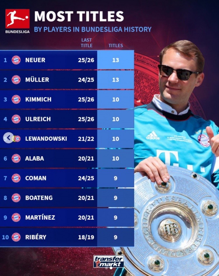 德甲历史最佳:诺伊尔与穆勒同列顶尖,拜仁独占前十席位