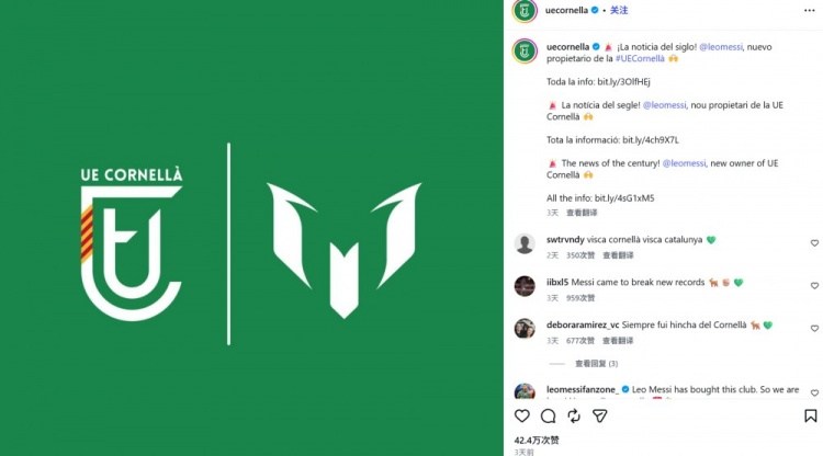 梅西效应爆发:科内利亚收购前粉丝仅3.9万,现狂增至58万超越西班牙人