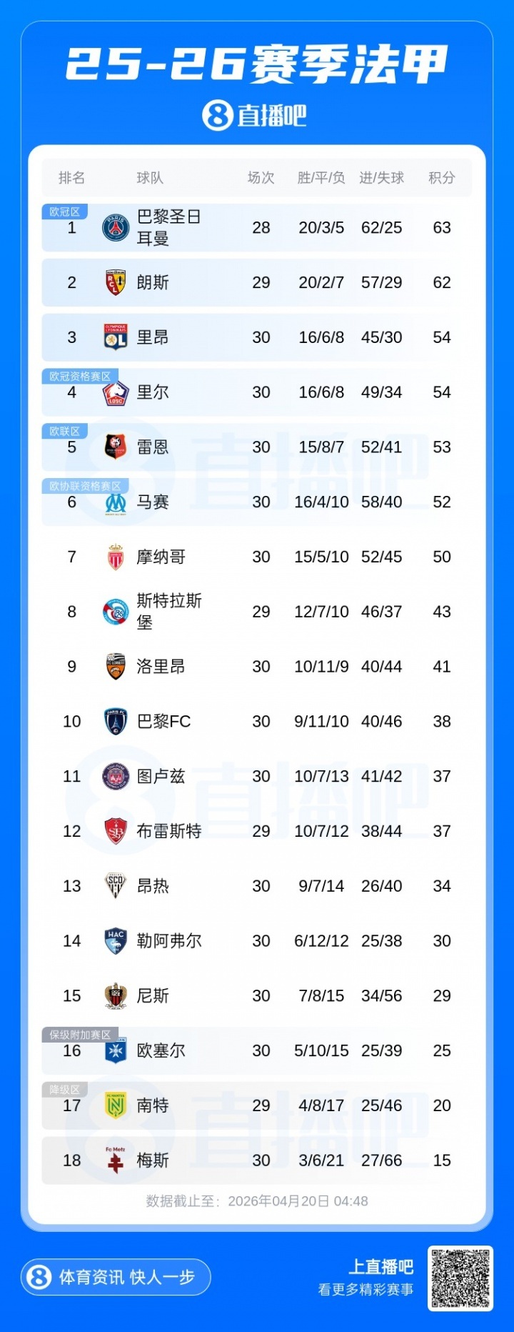 法甲积分榜战况:巴黎客场失分,差距仅1分且少赛1轮