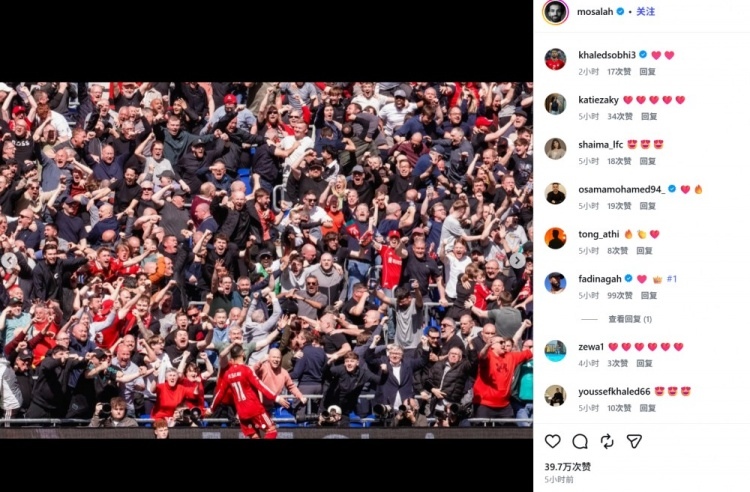 利物浦客场2-1险胜埃弗顿,萨拉赫第28分钟接球推射破门,为球队首开纪录。由于萨拉赫已宣布赛季结束后离队,这球将成为他在默西赛德郡德比的绝唱。赛后,他通过社交媒体晒出与球迷的庆祝合影,但未留下任何文字。