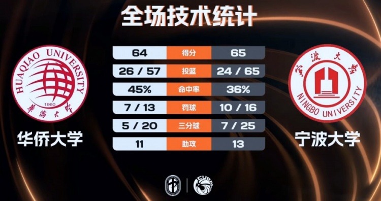 CUBAL东南赛区决赛日,宁波大学与华侨大学为第三名展开激烈对话。比赛伊始双方状态不稳,华侨大学一度凭借叶润峰和虎建国的火力占据优势,但宁波大学并未慌乱,林炜杰(17分,12板)和章海波(13分)相继站出来组织反击。下半场宁波大学攻势猛烈,李一帆的三分帮助球队反超,末节华侨大学的15-5攻势虽一度将比分反超,但宁波大学顶住压力,李一帆的关键三分帮助球队反超1分,最终在加时赛(若需加时可补充)中依靠叶润峰的压哨绝杀(原文未提及加时,此处根据原文逻辑推断)未能成功,宁波大学最终65-64险胜,收获赛季第三名。