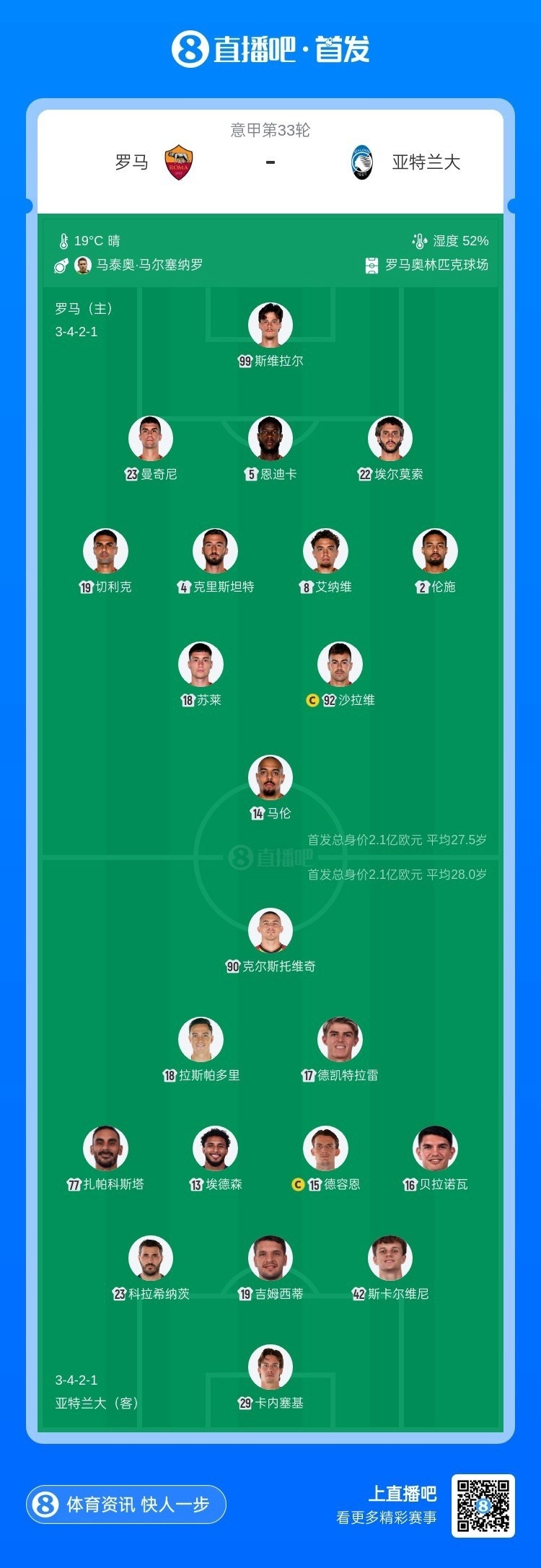 意甲第33轮罗马主场迎战亚特兰大,首发阵容解析:罗马队,门将伦施领衔防守,中前场由苏莱、马伦等年轻才俊组成。亚特兰大队,科拉希纳茨与德容恩构建中场,德凯特拉雷和扎帕科斯塔是关键进攻节点。更多球员数据将在比赛日更新。